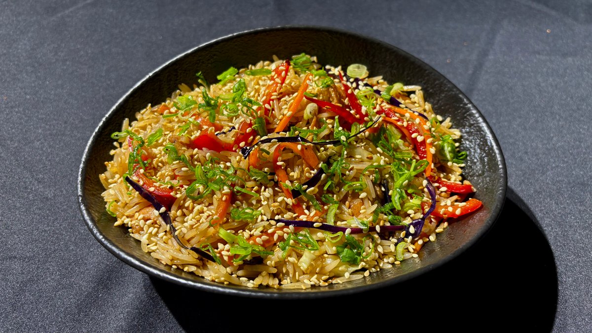 ბრინჯი, წითელი და თეთრი კომბოსტო, სტაფილო, წითელი ბულგარული, მწვანე ხახვი, სეზამის მარცვალი.