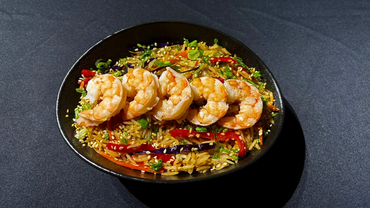 ბრინჯი, კრევეტები, წითელი და თეთრი კომბოსტო, სტაფილო, წითელი ბულგარული, მწვანე ხახვი, სეზამის მარცვალი.