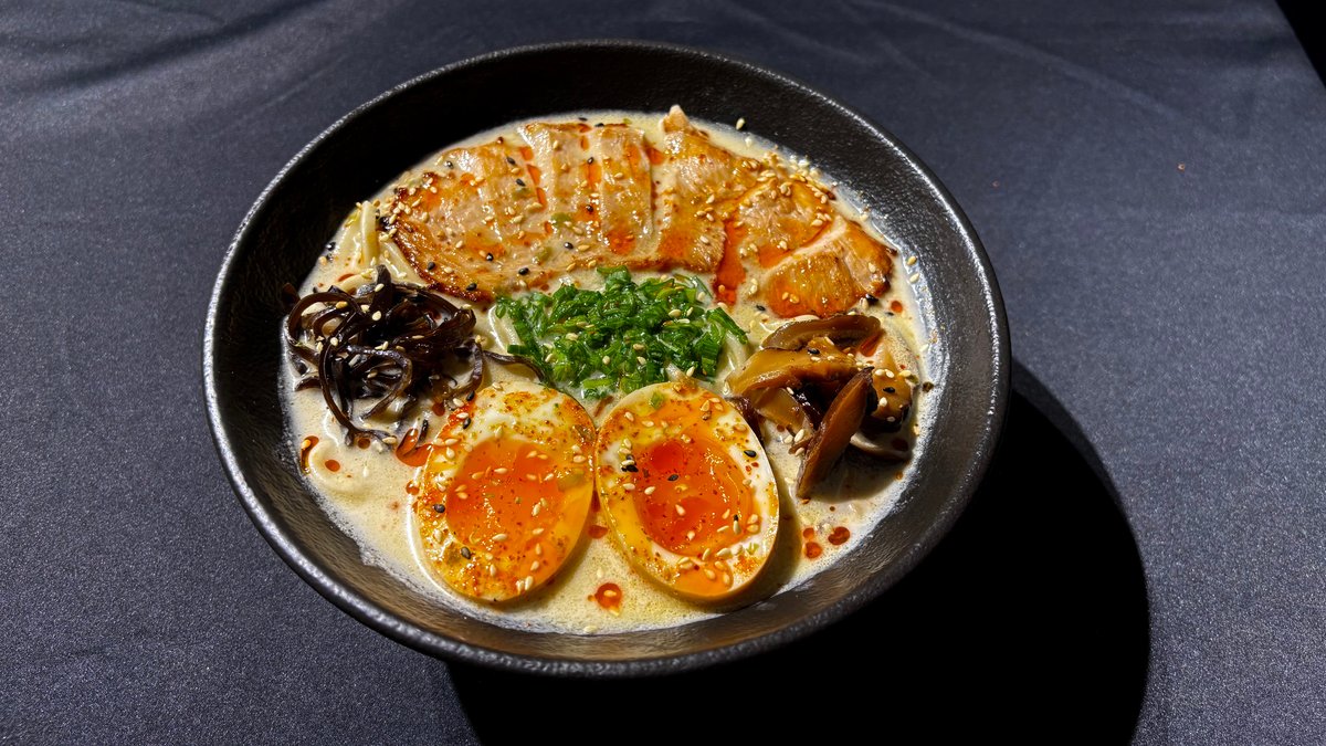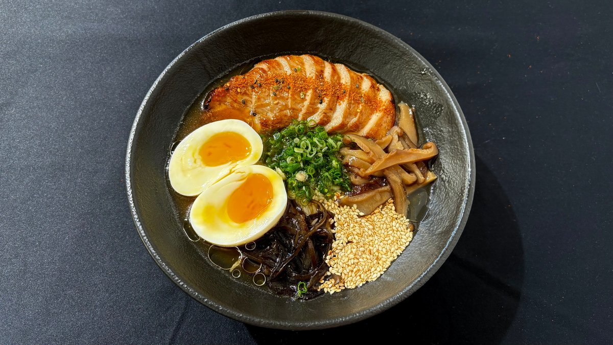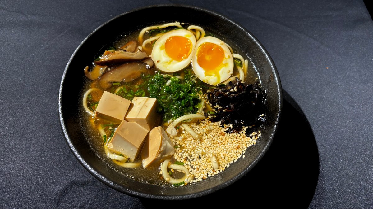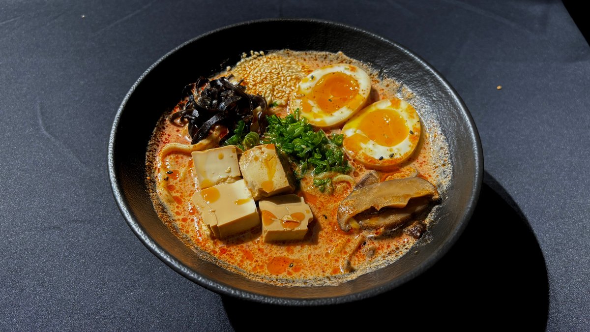 მისოს ბულიონი, რამენის ატრია, დამარინადებული კვერცხი, სოკო ფუნგუსი, სოკო შიტაკი, დამარინადებული ტოფუ, მწვანე ხახვი, სეზამის მარცვლები.