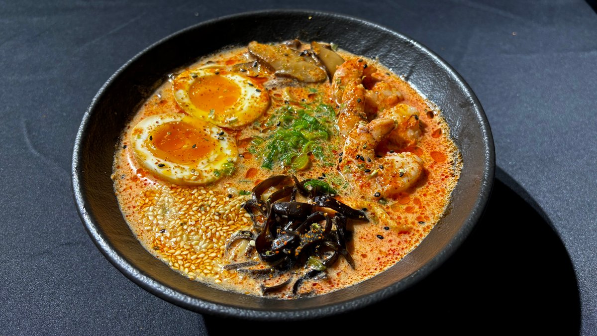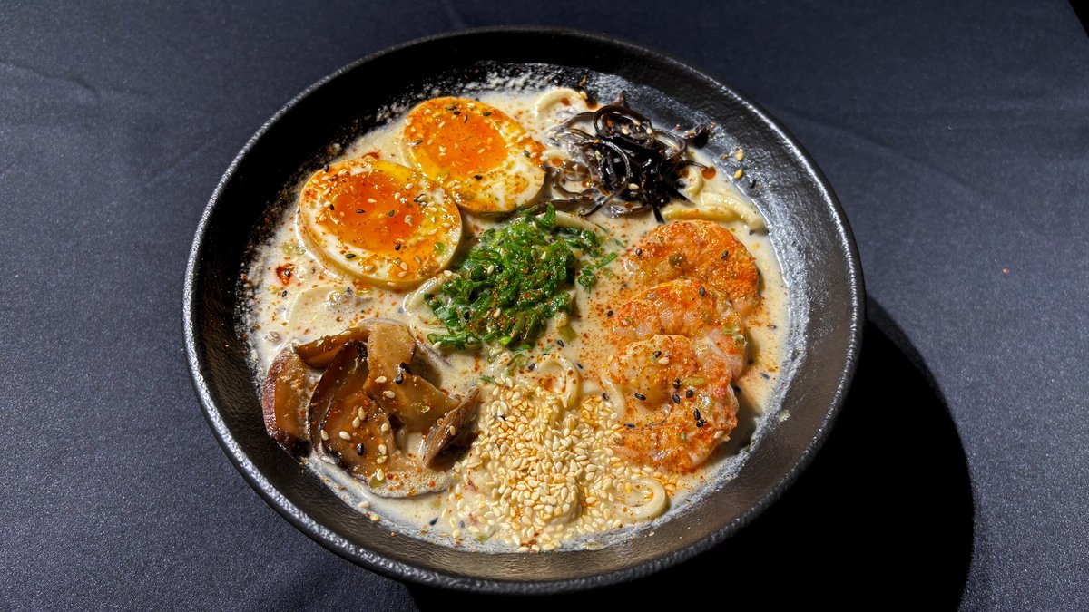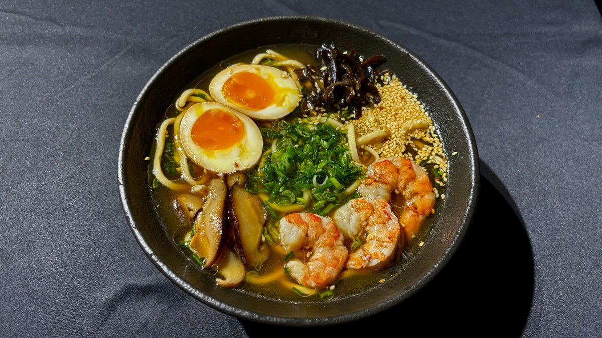 მისოს ბულიონი, კრევეტები, რამენის ატრია, დამარინადებული კვერცხი, სოკო ფუნგუსი, სოკო შიტაკი, მწვანე ხახვი, სეზამის მარცვლები.