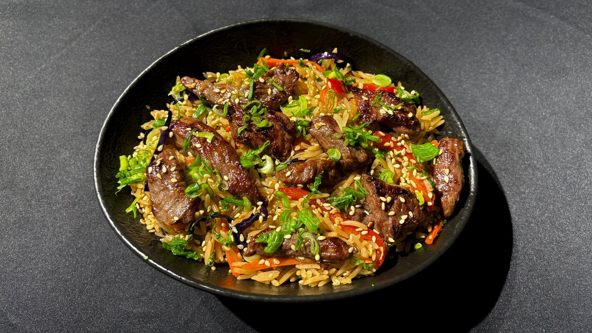 ბრინჯი, დამარინადებული ქათამი, წითელი და თეთრი კომბოსტო, სტაფილო, წითელი ბულგარული, მწვანე ხახვი, სეზამის მარცვალი.
