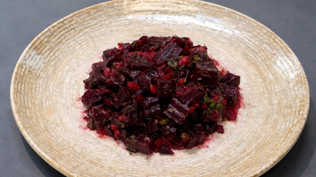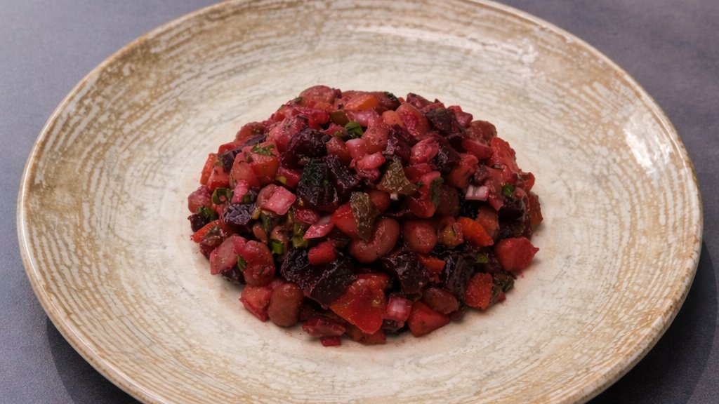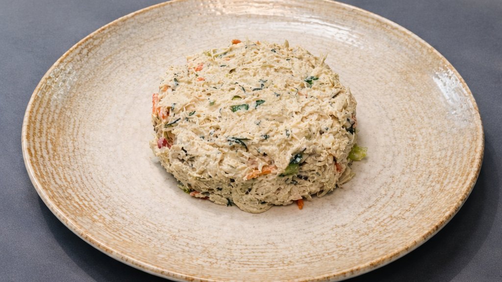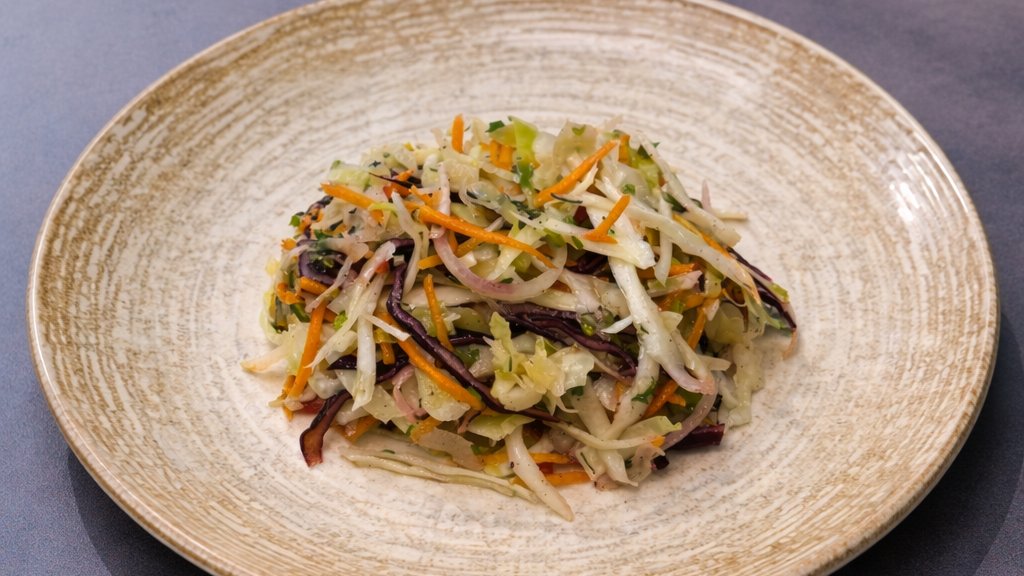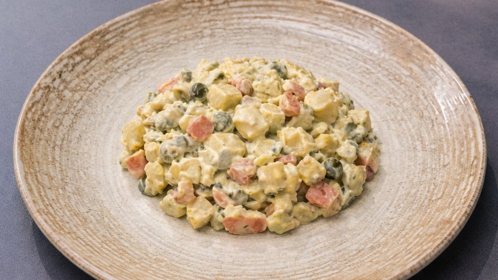 შემადგენლობა: კატოფილი, სტაფილი, მჟავე და ცოცხალი კიტრი, ბარდა, მაიონეზი.