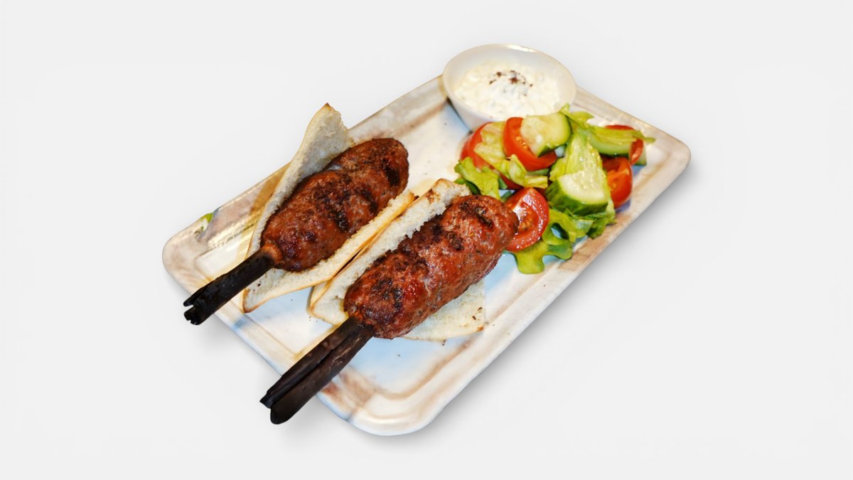 ცხვრის ქაბაბი პიტას პურში, დარიჩინის ჩხირებით,ძაძიკის სოუსითა და ბოსტნეულის სალათით.