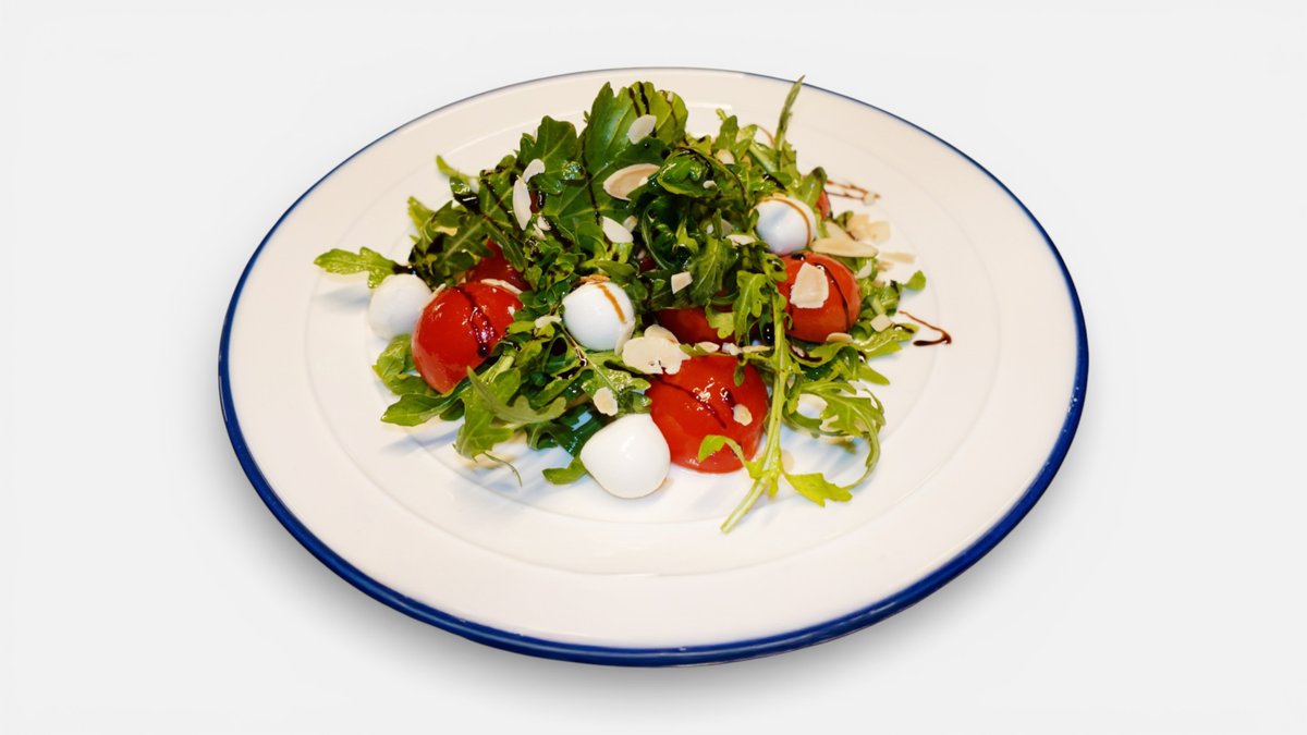 ჩერი პომიდორი, მოცარელას ბურთებით, რუკოლათი და ნუშის ფანტელით.