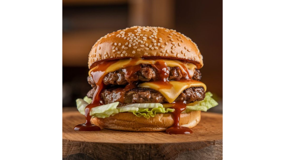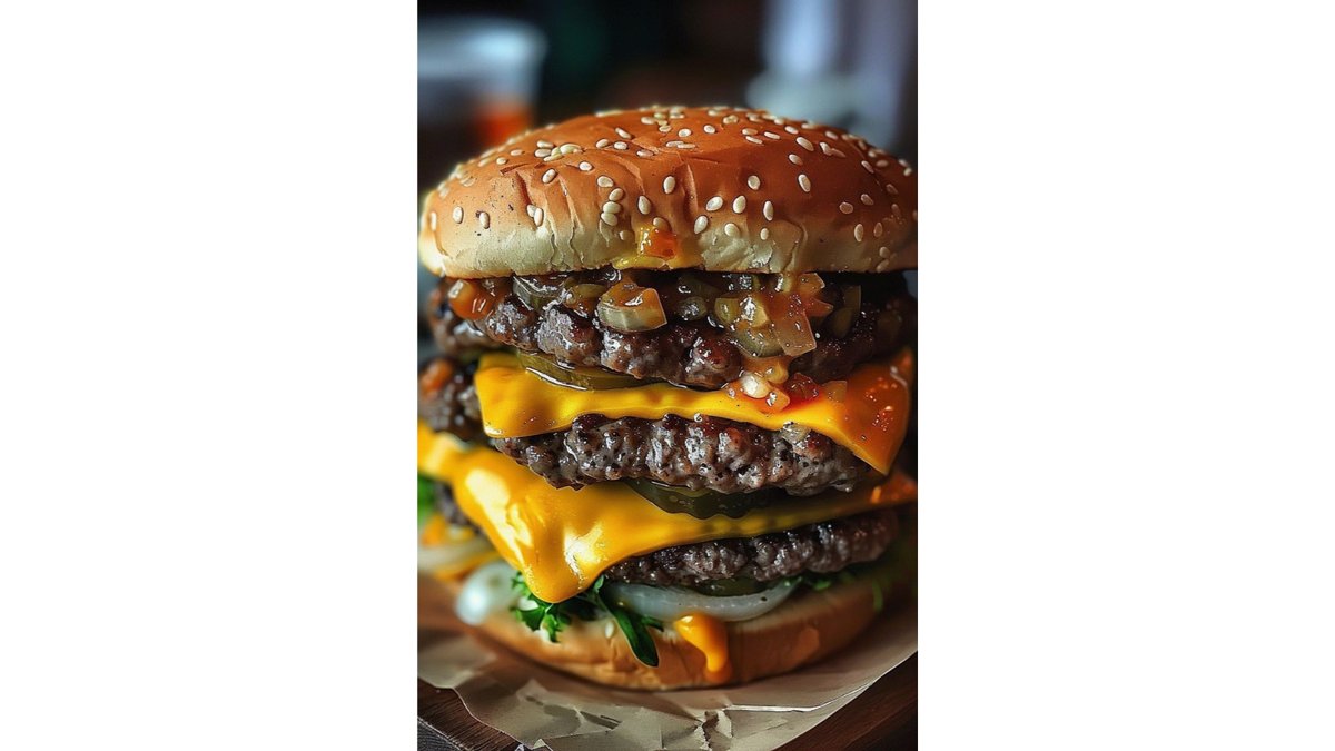 🍔 მახასიათებლები: ✅ სამმაგი წვნიანი საქონლის ხორცი 450გრ 🍖🍖🍖 ✅ ორმაგი მდნარი ჩედარის ყველი 🧀🧀 ✅ აისბერგის სალათის ფურცლები 🥬 ✅ კიტრის მჟავე & ხახვი 🥒🧅 ✅ ახალი და არომატული ბულკი 🍞 ✅ უნიკალური სოუსი 😋