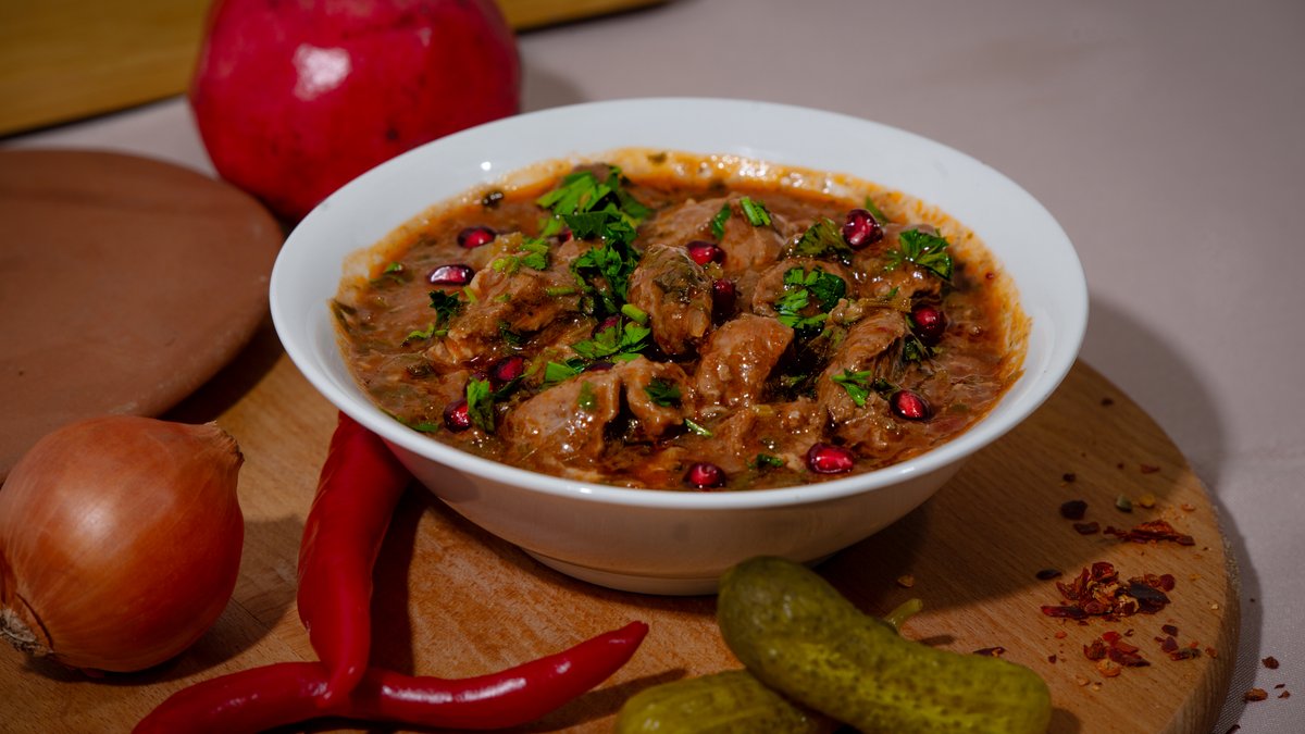 ინგრედიანტები : საქონლის ხორცი , ტომატი ,ხახვი ,ნიორი , მწვანილები , სანელებლები ,ბროწეული,კიტრის მარინადი , შავი წიწაკა. 350გრ