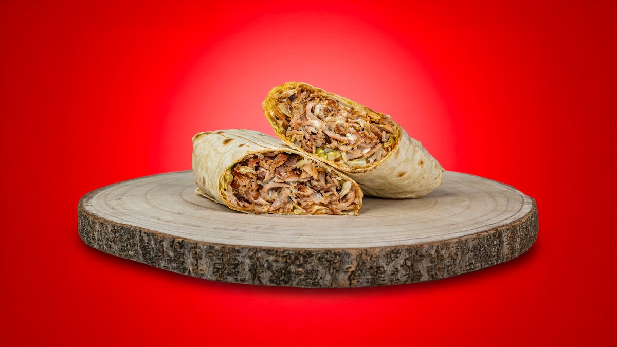 ღორის ხორცი, კარტოფილი ფრი, მაიონეზი, კეტჩუპი, სალათის ფურცელი, ხახვი, წიწაკა