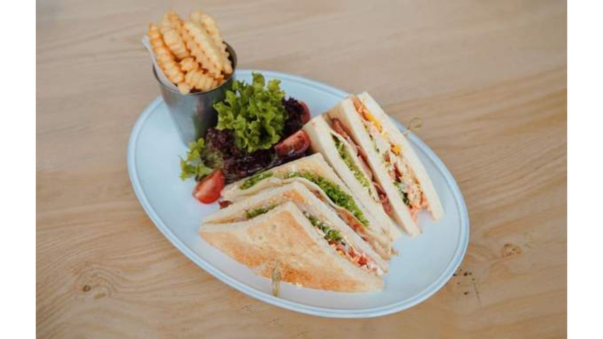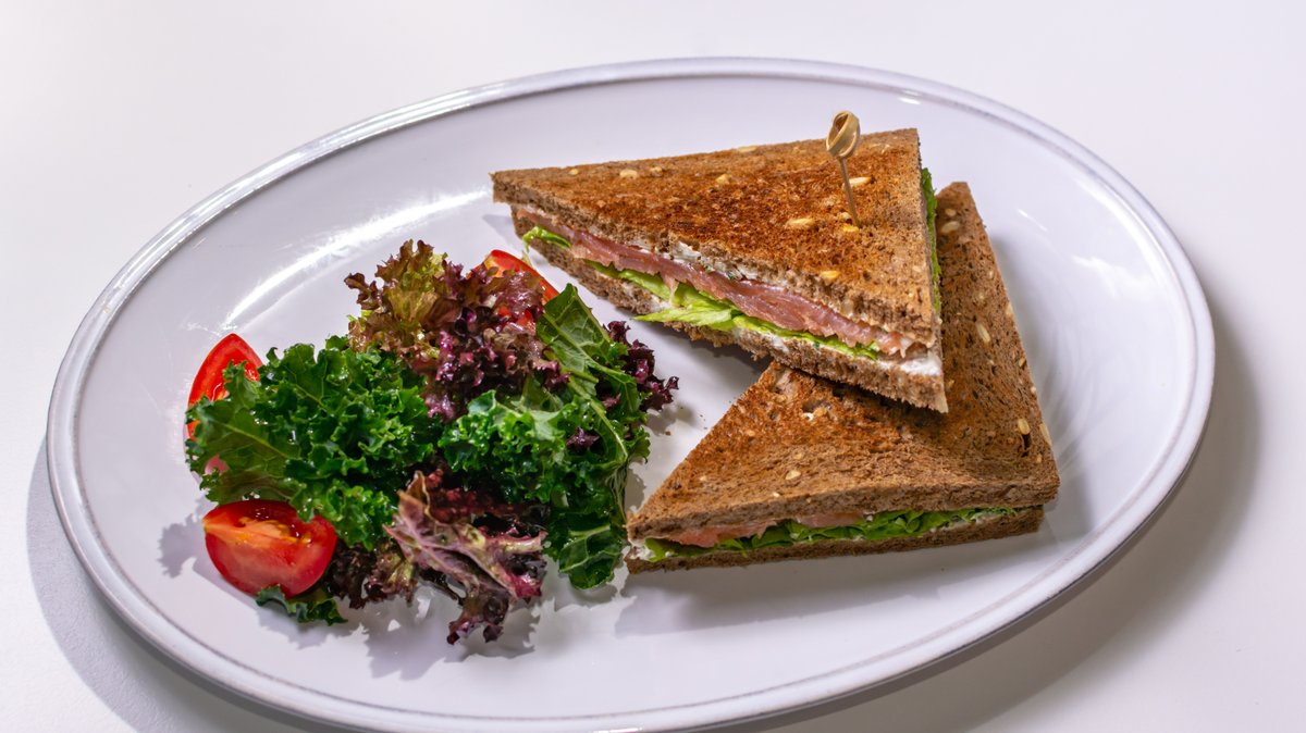 რუხი ტოსტის პური, კვერცხი, ყველი ჩედარი, პომიდორი, სალათის მიქსი