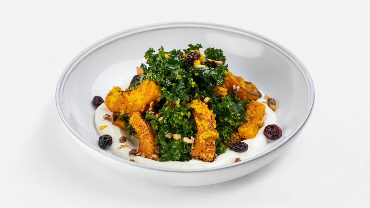 ქეილი, იოგურტის სოუსი, შტოშის ჩირი, გრანოლა