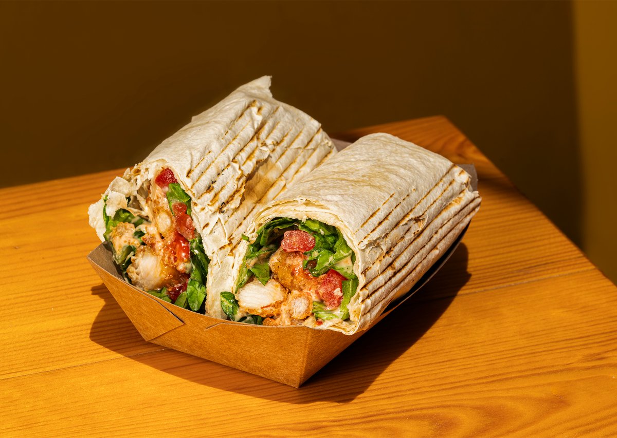 ტორტილია,ქათმის ფილე, პომიდორი, სალათის ფურცელი, სპეციალური სოუსი