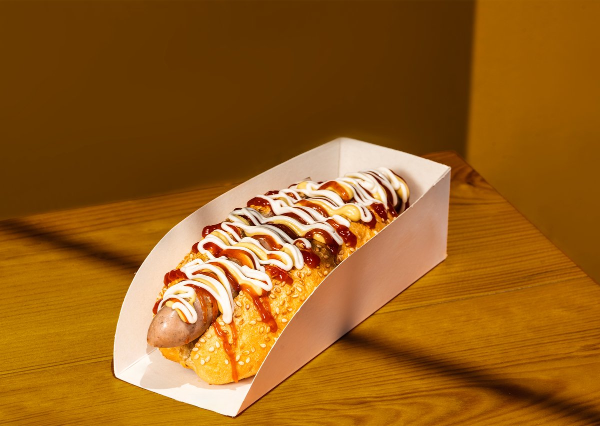 პური, შერეული სოსისის, კეჩუპი, მაიონეზი, მდოგვი
