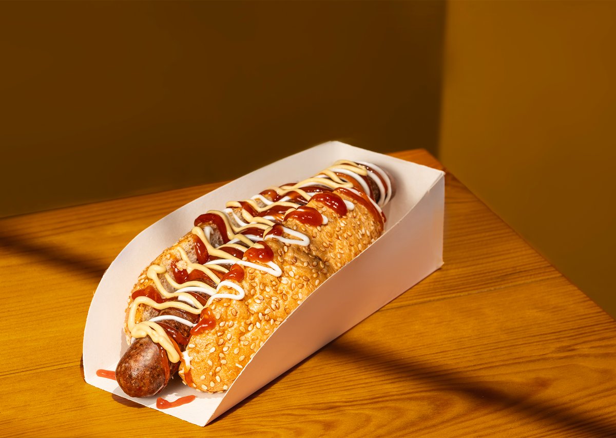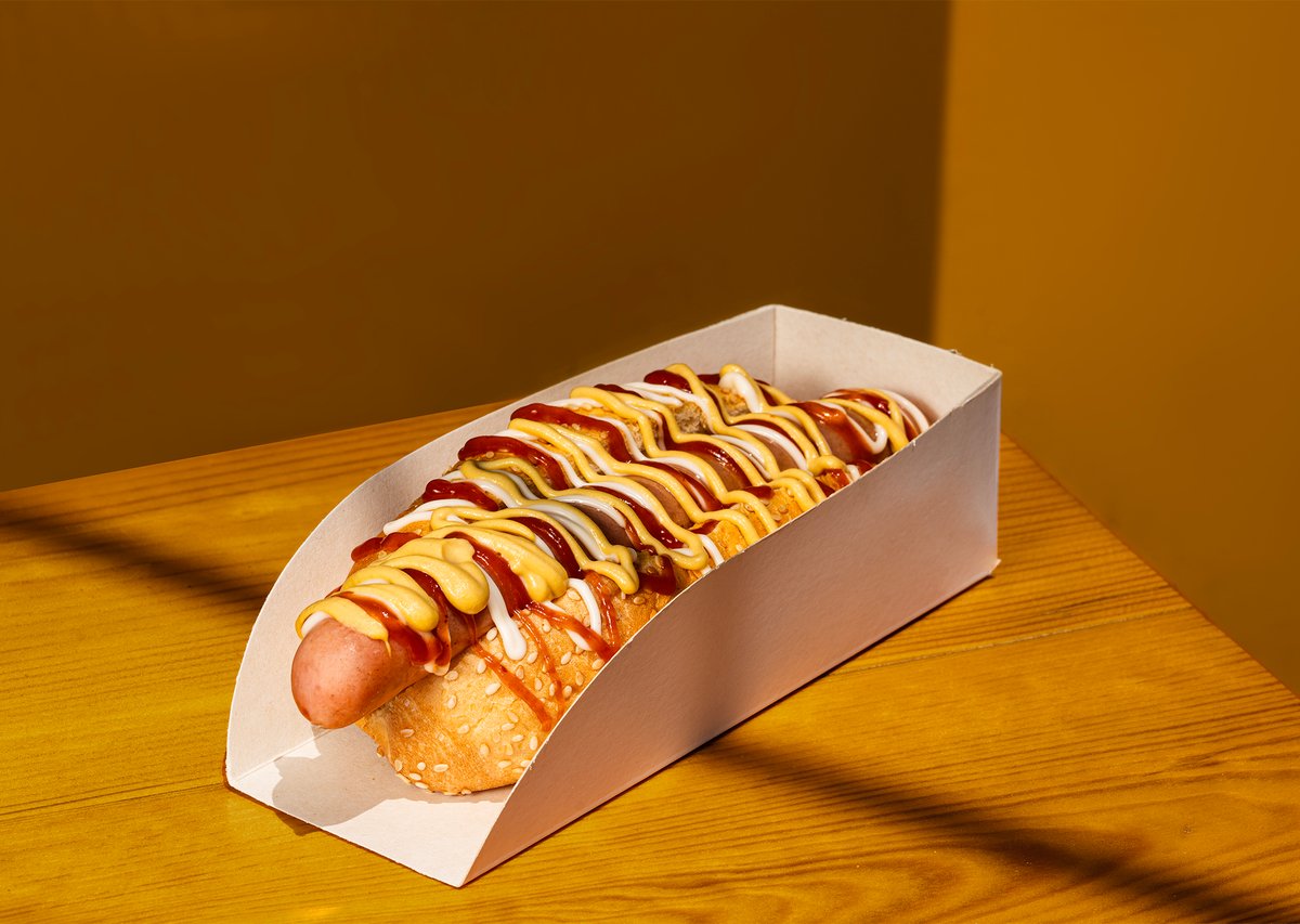 პური, შერეული-ცხარე სოსისი, კეჩუპი, მაიონეზი, მდოგვი