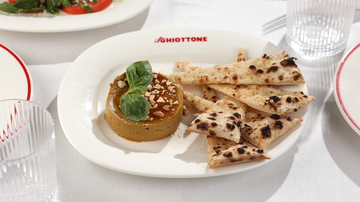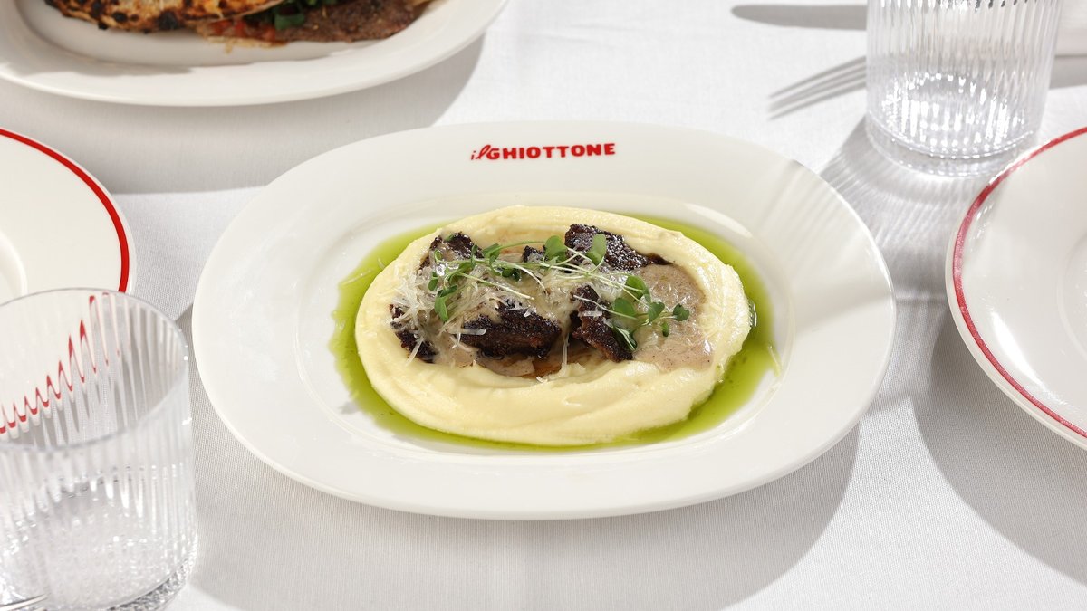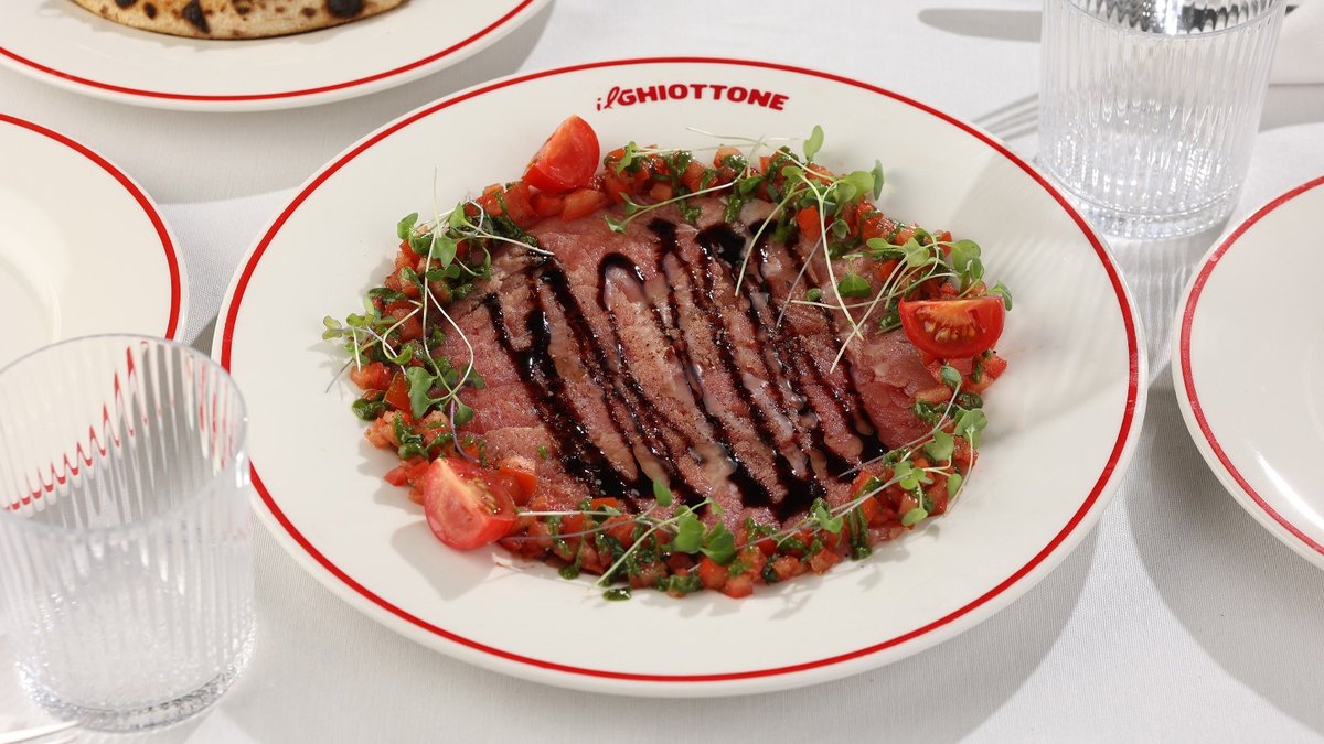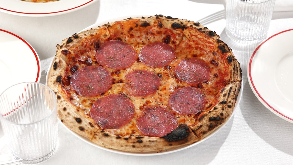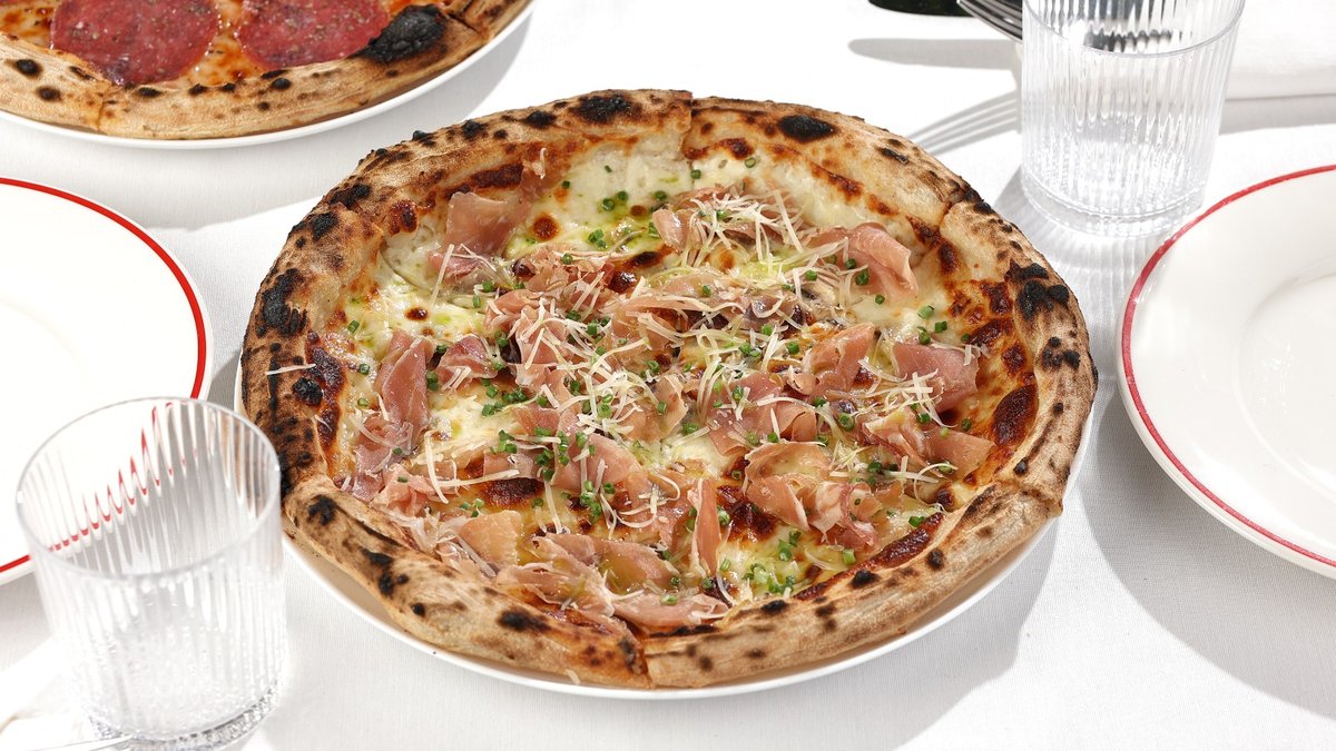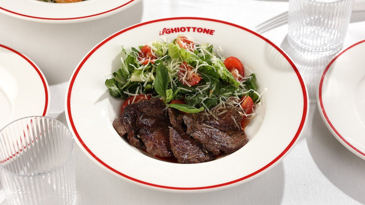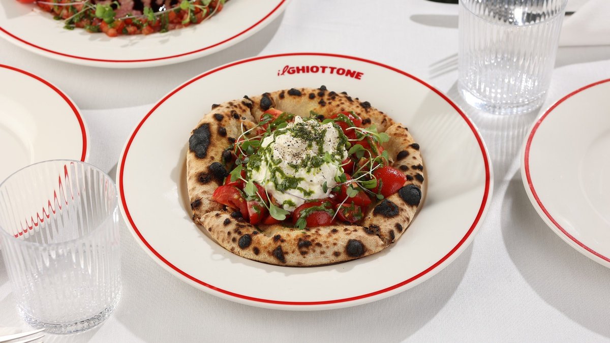 ტრუფელი, რუკოლა, პომიდვრის სოუსი, მორტადელა, სტრაჩატელა