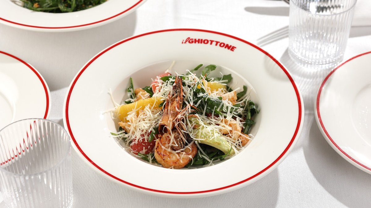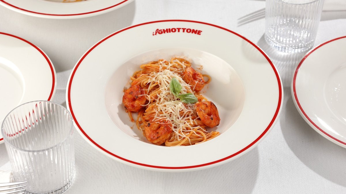 კრევეტები, პომიდვრის სოუსი, ბაზილიკი, პარმეზანი
