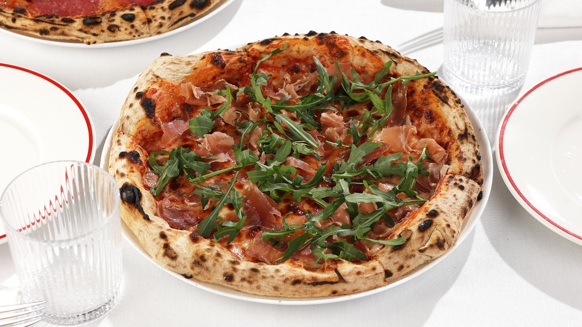 ტომატის სოუსი, მოცარელა, პროშუტო, რუკოლა