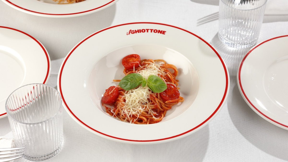 რიგატონი,ჩერი, პომიდვრის სოუსი, პარმეზანი, წიწაკის ჯემი