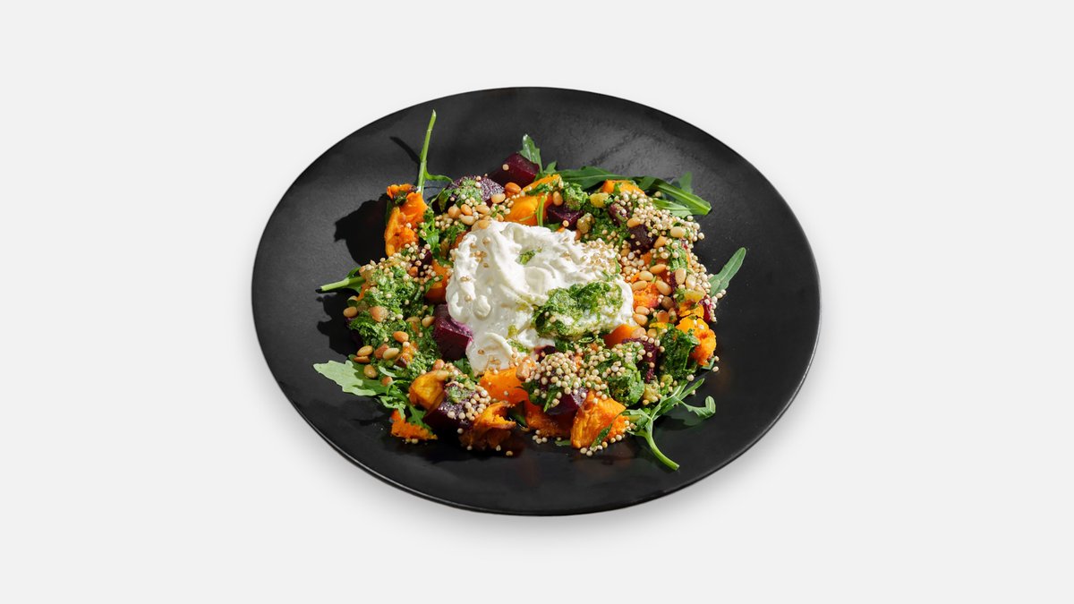 სტრაჩატელას ყველით, კედრის მარცვლებით, ჩიმიჩურით, სალათითა და ქინოას მარცვლებით
