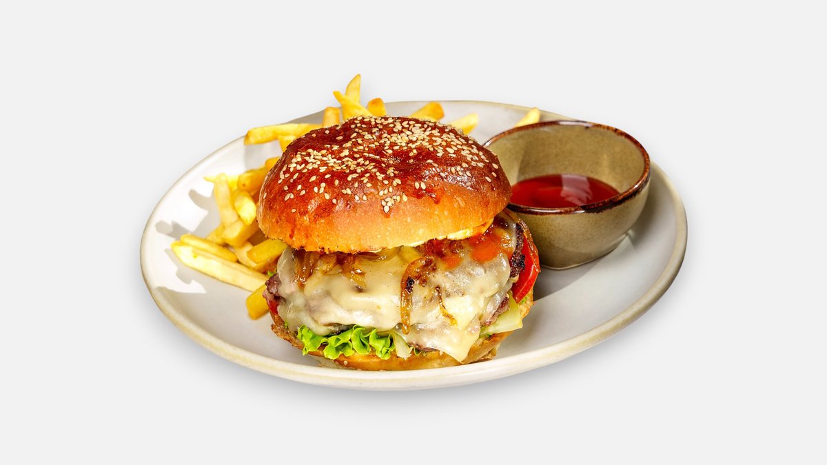 პომიდვრით, ხახვით, ჩედარით, მდოგვით, სალათის ფოთლებით, კარტოფილი ფრითა და კეტჩუპით