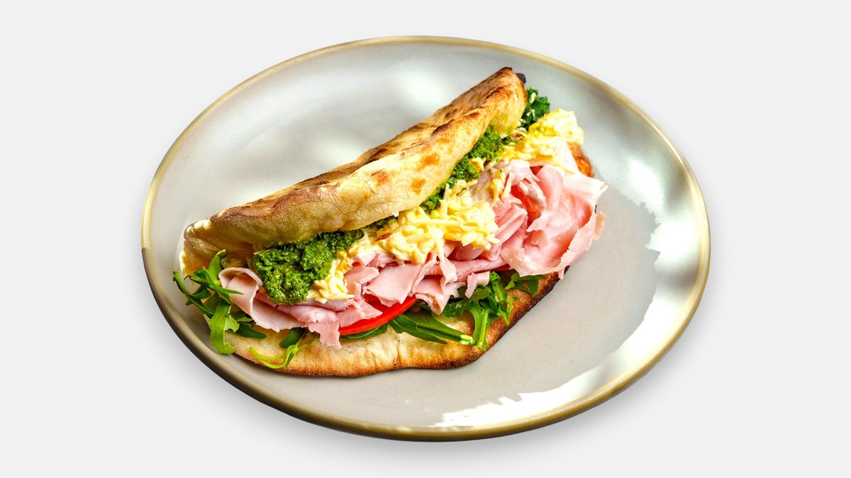 ჩედარით, მაიონეზით, რუკოლათი, პომიდვრითა და პესტოს სოუსით