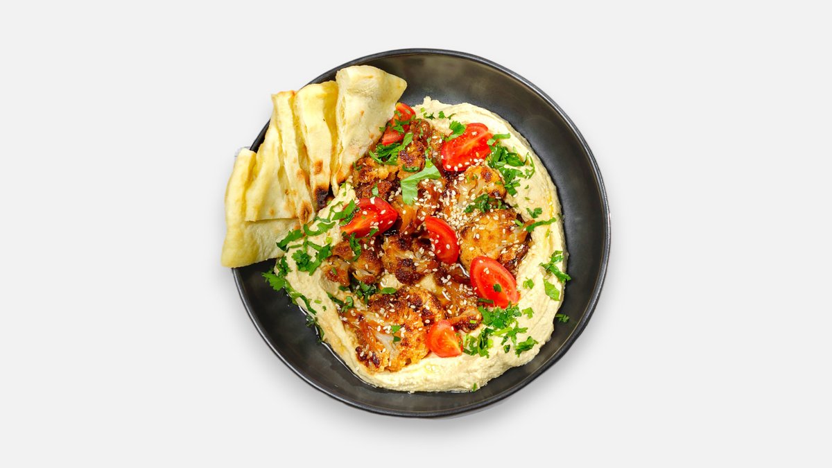 ჰუმუსით, კალეს სალათით, ჩერი პომიდვრითა და სეზამით