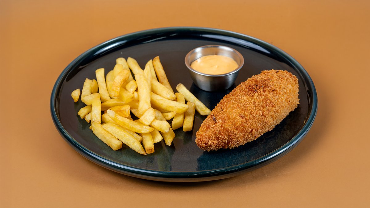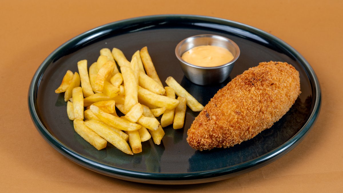 Киевская котлета с сыром, картофелем фри и огуречным кетчупом.