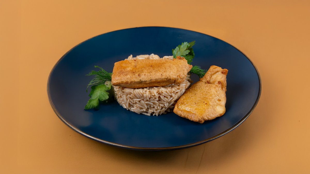 Тилапия с рисом в сливочном соусе и соусом терияки.