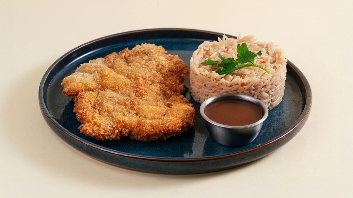 Свиной шницель со сливками, рисом и соусом терияки.