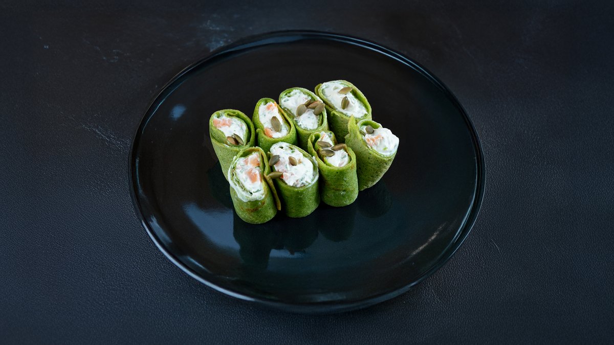 Блины со шпинатом, расплавленным сыром и лососем.