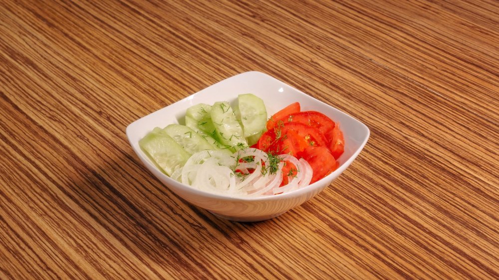 Cucumber, tomato, onion and oil.