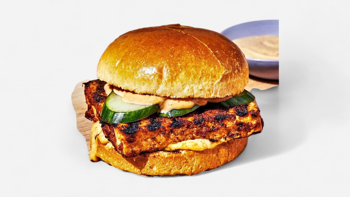 Tofu Marinated in Spices & Soy Sauce, Cucumber, Tomatoes, Pickles, Lettuce, Onion, Special Vegan Sauce