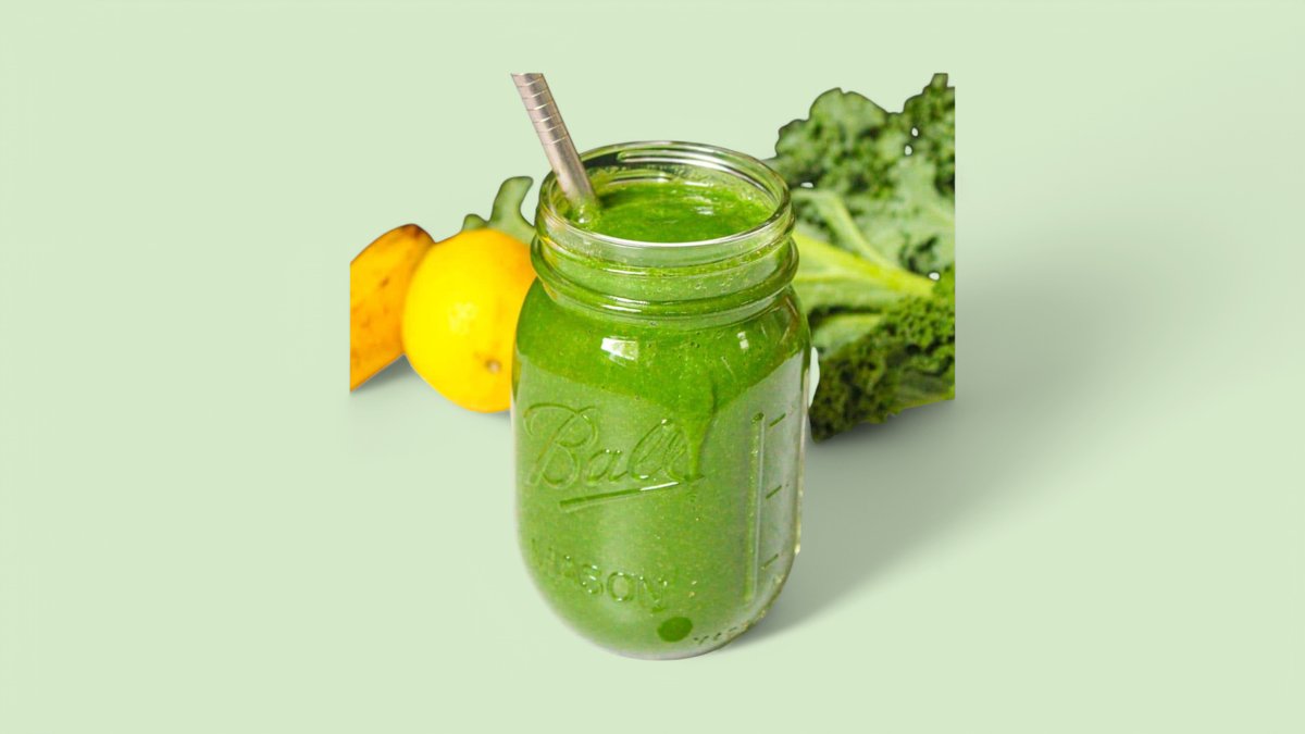 Matcha, apple, banana, lemon, ginger, cucumber, mint, kiwi, parsley, water.