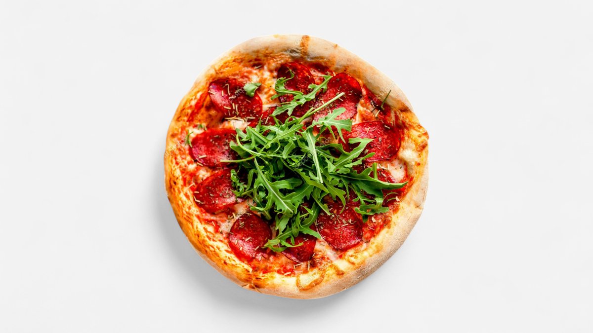 ცომი, პეპერონი, პიცის სოუზი, მოცარელა, ორეგანო, რუკოლა