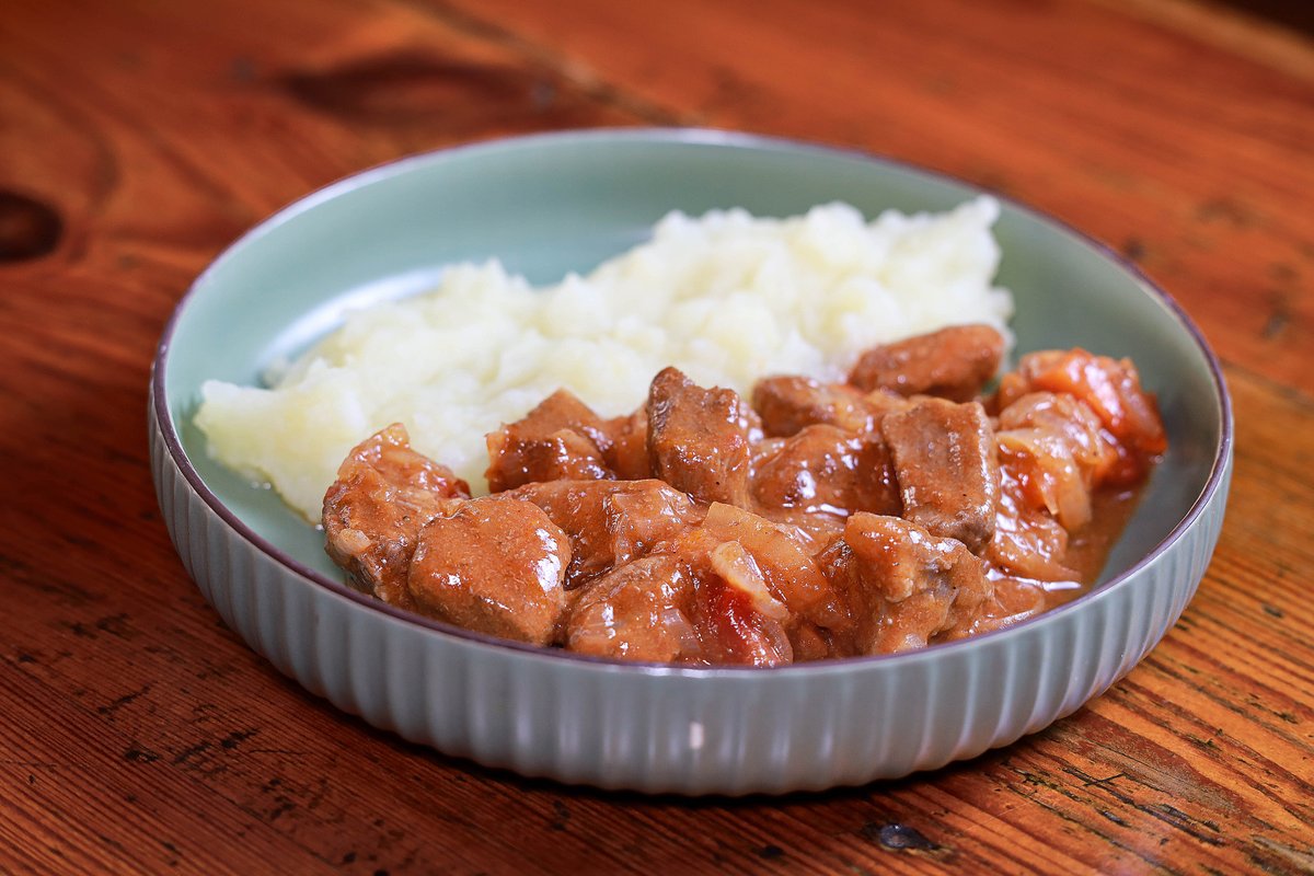 საქონლის ხორცი, ღვინო, ტომატის პასტა, პომიდორი, ხახვი, კარტოფილი, კარაქი