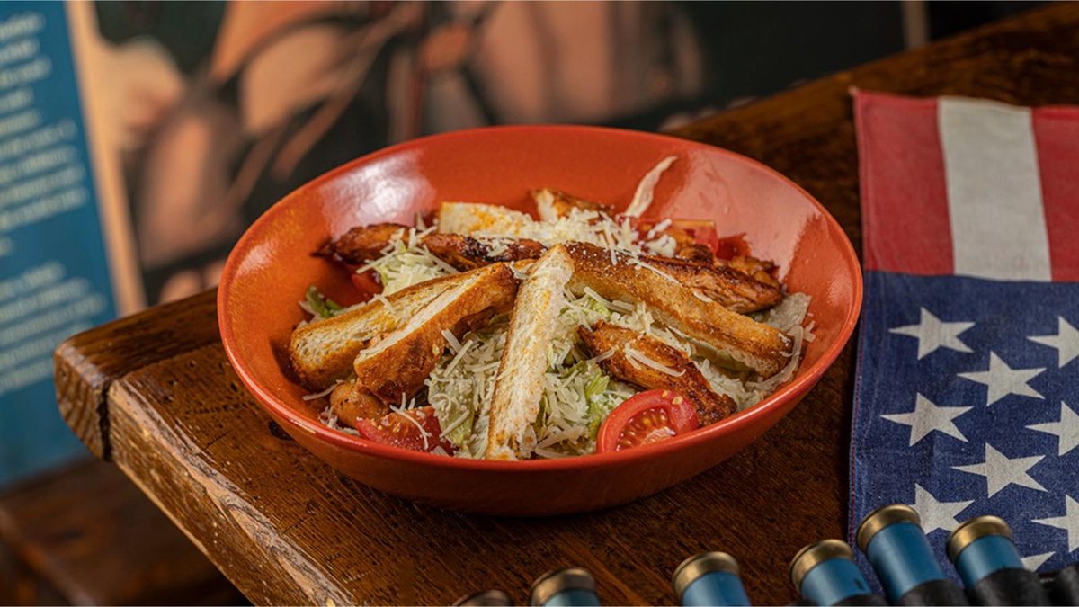 საქონლის ხორცი, ჩედარი, სალათი, ფუნთუშა, სოუსი, დამარინადებული ხახვი