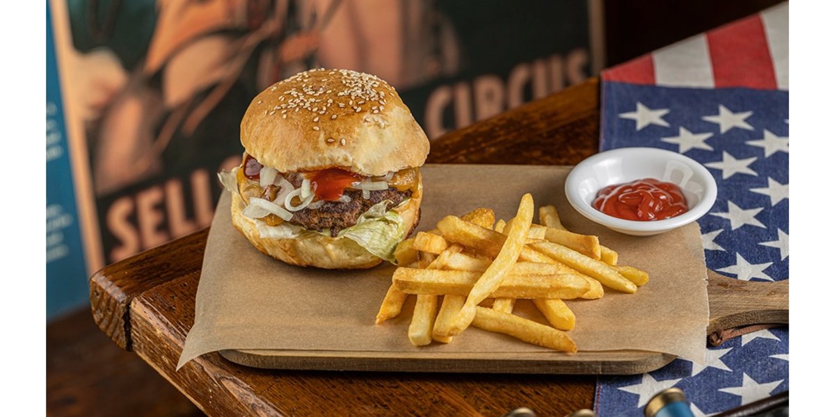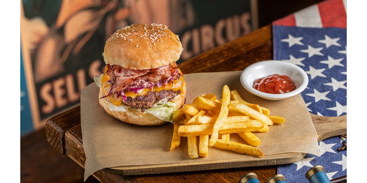საქონლის ხორცი, ჩედარი, სალათი, ფუნთუშა, სოუსი, ქოულსლოუ, ბეკონი