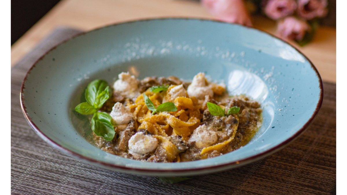 ტალიატელე, კალმახა სოკო, ქამა, ტრიუფელის ზეთი, მარილი, დაფქული შავი პილპილი, პარმეზანი