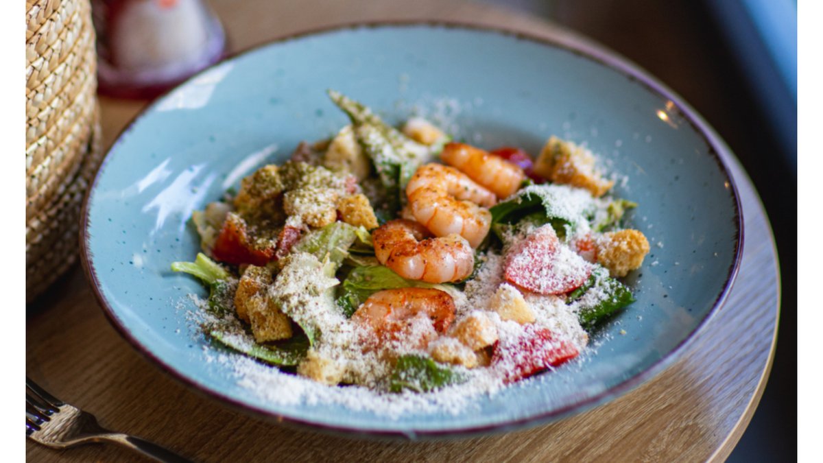 სალათის მიქსი, შემწვარი კრევეტები, პომიდორი, კრუტონები, ცეზარის სოუსი, პარმეზანი