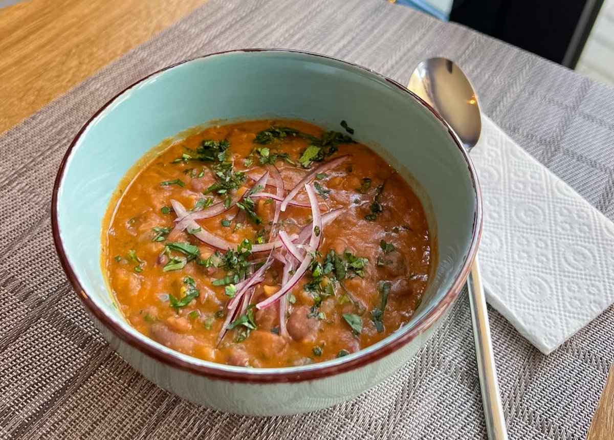 ლობიო ,ტომატ პასტა ,ხახვი ,მზესუმზირის ზეთი (ხმელი ქინძი ,უცხო სუნელი), ქინძი "