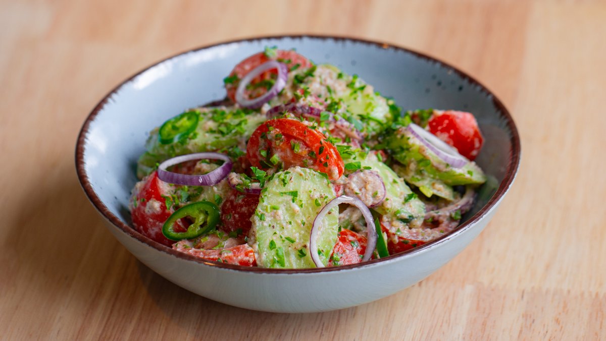 პომიდორი, კიტრი, წიწაკა, წითელი ხახვი, მწვანილი, კახური ზეთი, ნიგოზი, მარილი, ღვინის ძმარი