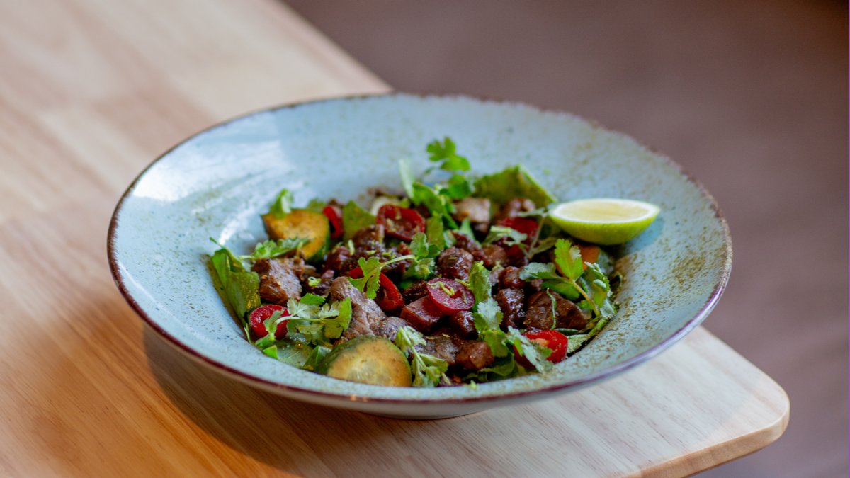 თბილი სალათა .საქონლის ხორცით და ბადრიჯნით