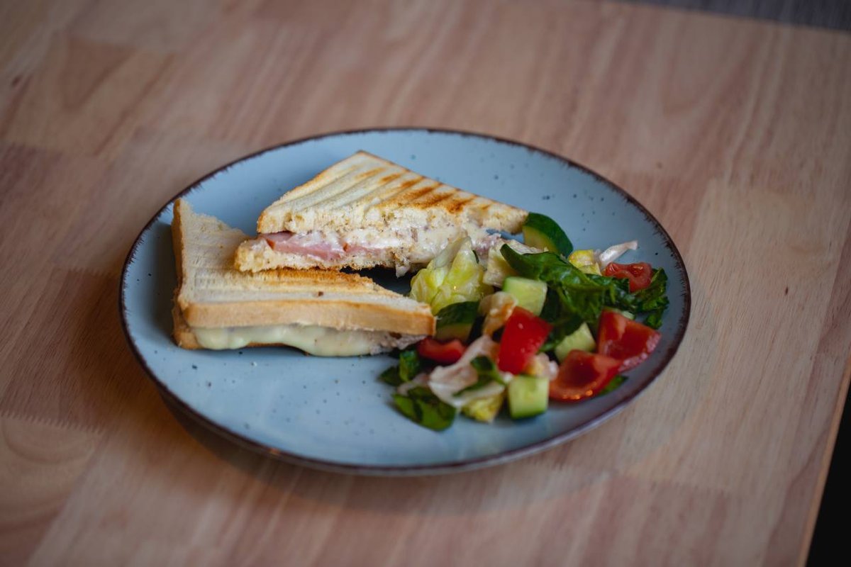 ცხელი ტოსტი ყველით, ლორით და მწვანე სალათით