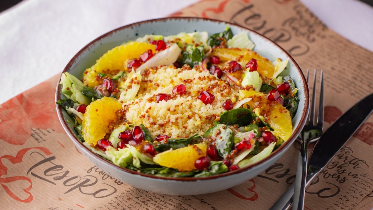 სალათის მიქსი, ბროწეული, ფორთოხალი, ლიმონი, დიჟონის მდოგვი, თაფლი, ხახვი, ნიგოზი, კუსკუსი,