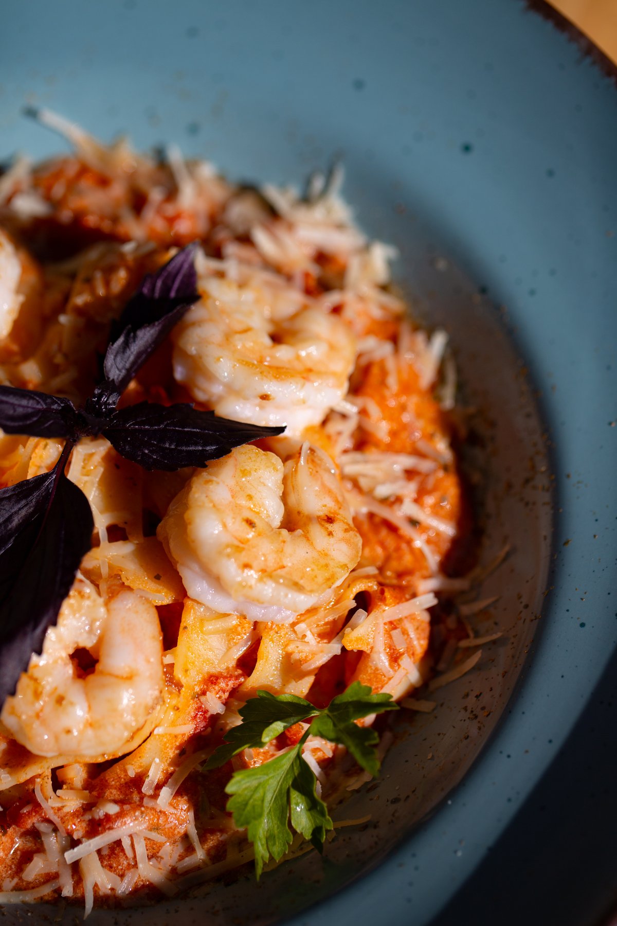 ტალიატელე, კრევეტები, მარინარას სოუსი, ნაღები, მარილი, პილპილი, სანელებლები, პარმეზანი