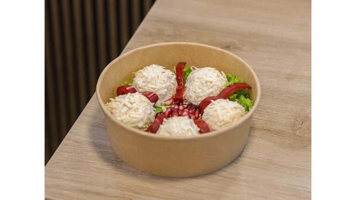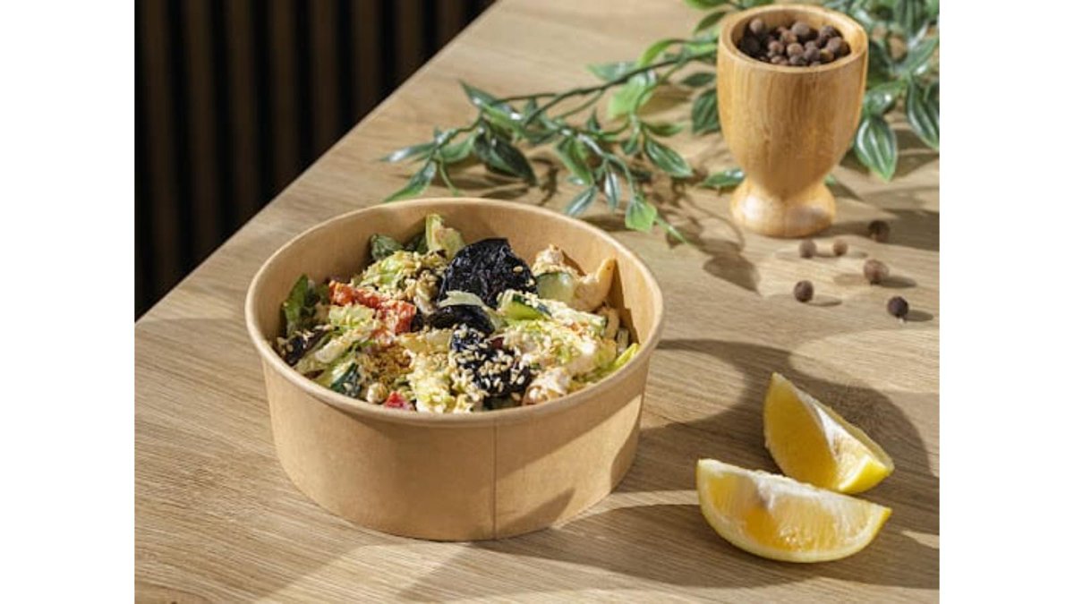 ქათმის ფილე, სალათის ფოთოლი, კიტრი, წით. ბულგარული, შავი ქლიავის ჩირი, სეზამის მარცვალი, მაიონეზის დრესინგი