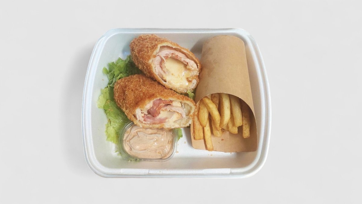 კორდონ-ბლუ (ქათმის ხორცი ბეკონით, სულგუნით და სპეც სოუსით)