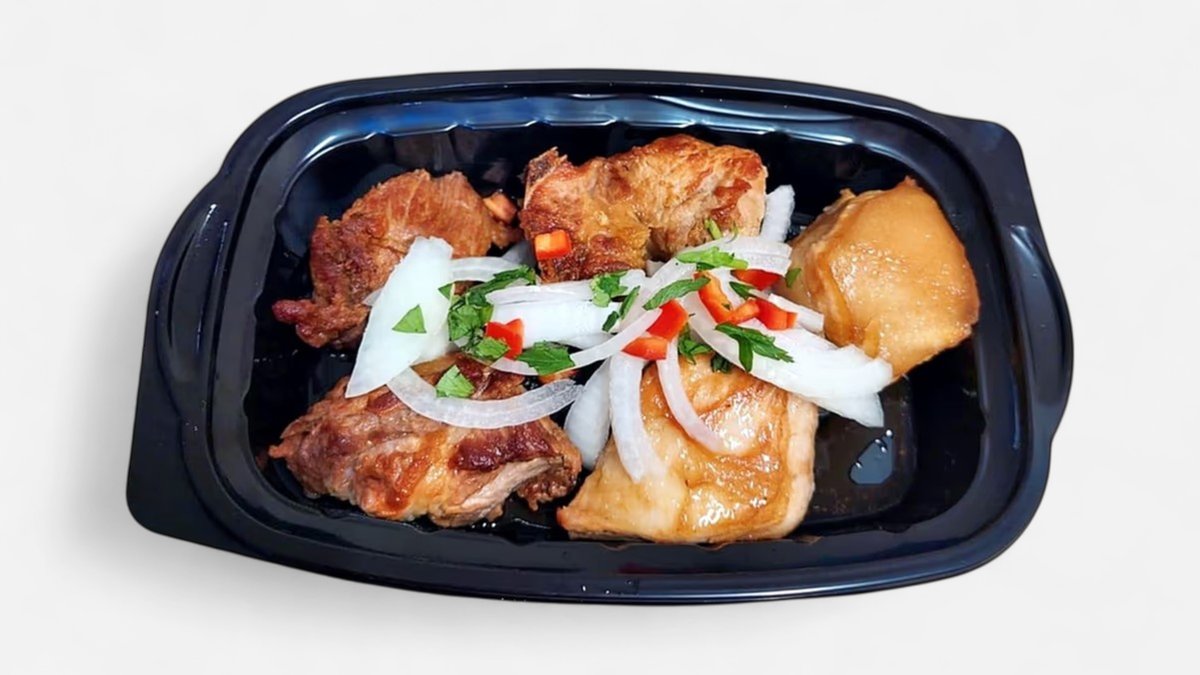 ქათმის ფილე, ხახვი, მწ. ბულგარული, წით. ბულგარული, სოიოს სოუზი, სეზონური ხილი, მაიონეზი, ხაჭოს ნამცხვარი