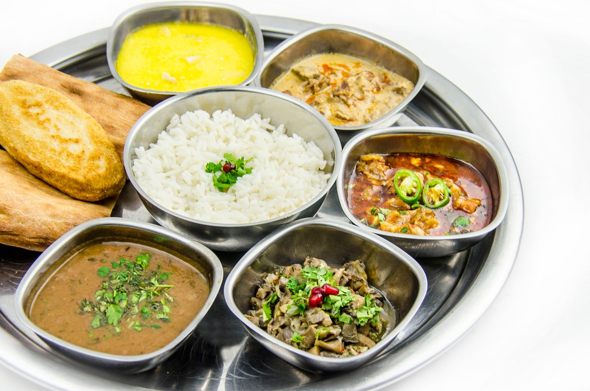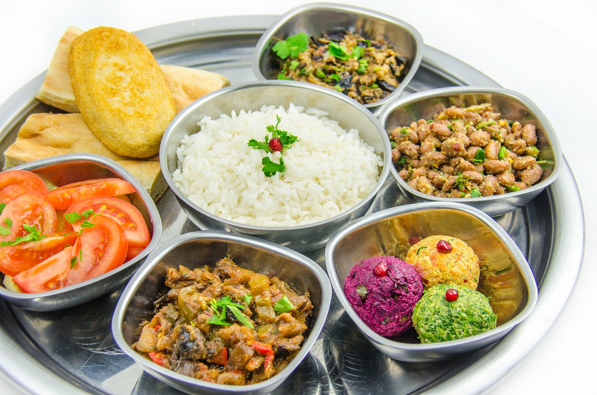 აჯაფსადალი, კიტრი-პომიდორის სალათი, ნიგვზიანი ბადრიჯანი, ნიგვზიანი ლობიო ფხალის ასორტით, პური, ბრინჯი, მჭადი