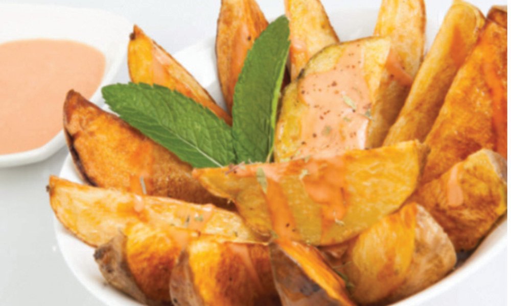 კარტოფილი ფრი, კიტრი-პომიდვრის სალათი, მდოგვის სოუსი
