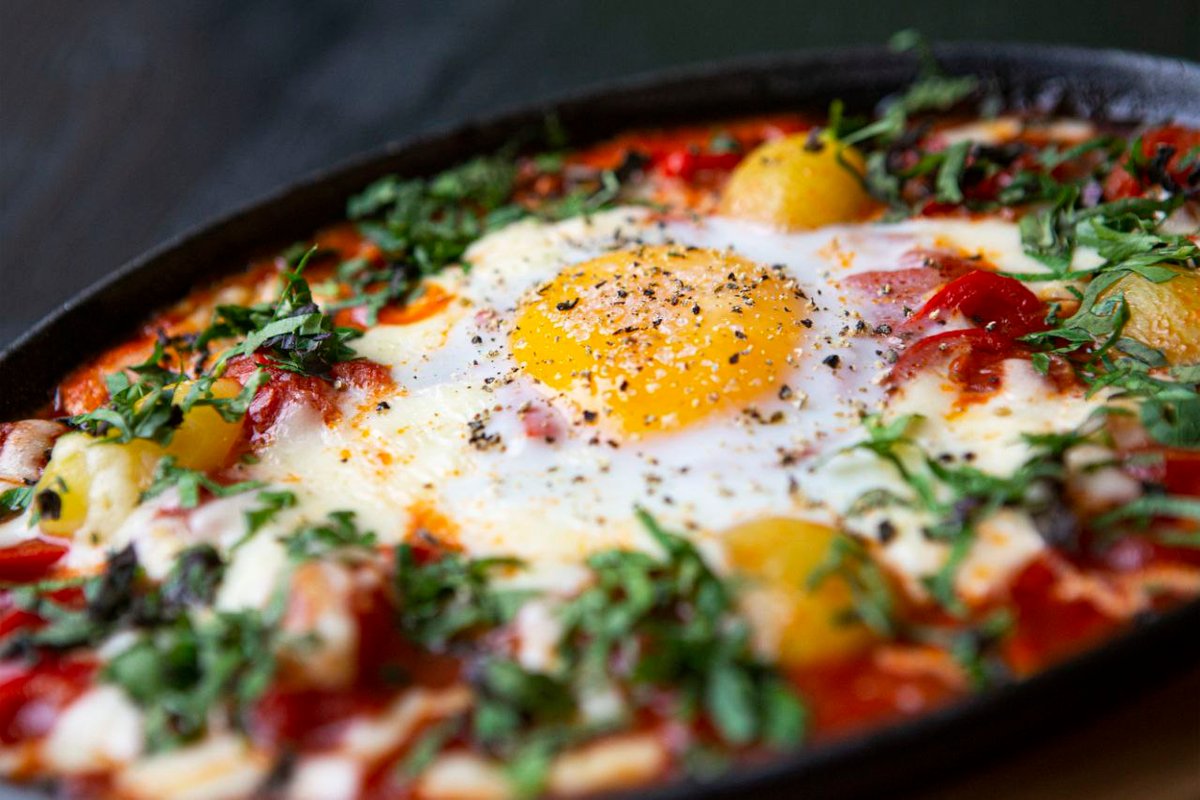 კვერცხი, კარაქი/ნაღები, შერეული სალათის ფოთოლი, ჩერი პომიდორი, ზეითუნის ზეთი