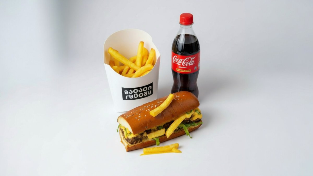საქონლის ხორცია ბურგერი, კარტოფილი ფრი, კოკა-კოლა